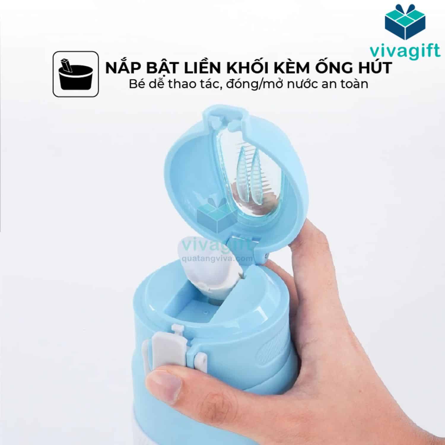 - Nắp bật liền khối tích hợp ống hút giúp bé dễ dàng uống nước mà không cần mở nắp hoàn toàn.