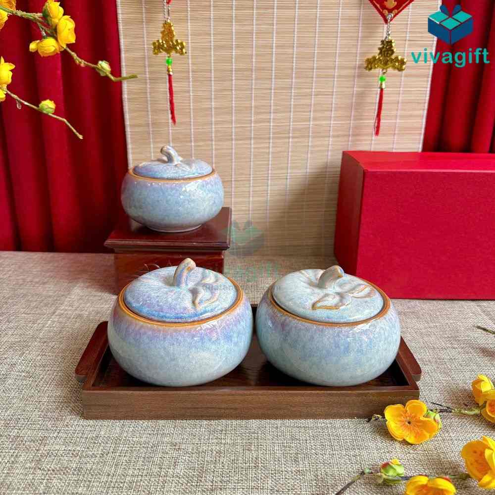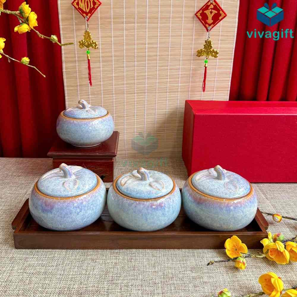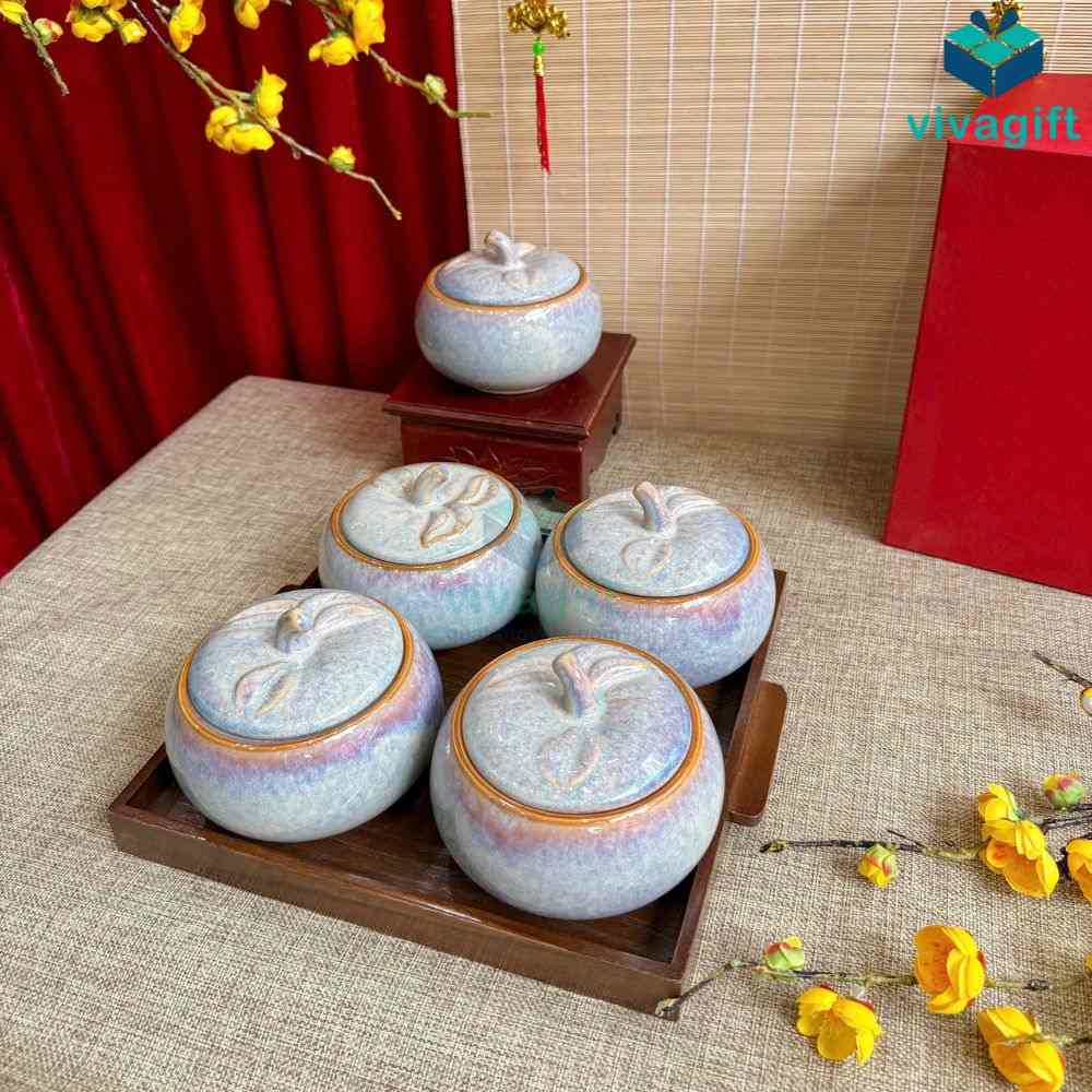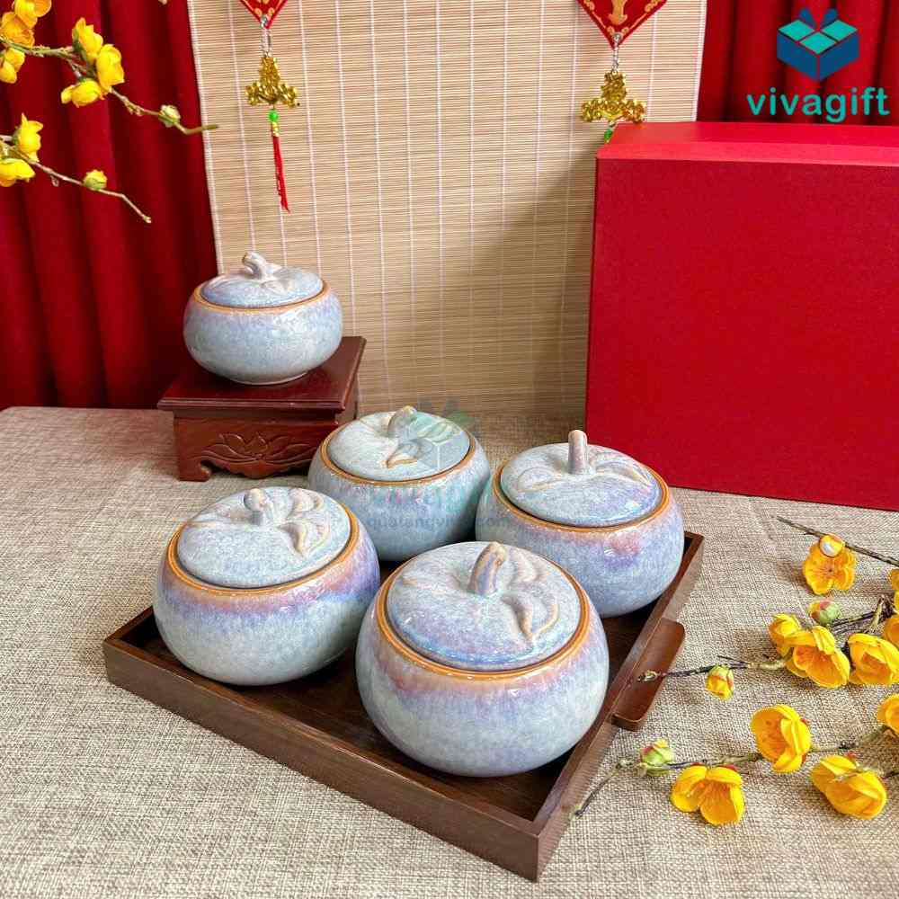 Sản phẩm được nung ở nhiệt độ cao trên 1.200°C, đảm bảo an toàn khi đựng thực phẩm, hạn chế nứt vỡ và giữ màu men bền đẹp theo thời gian. Nắp hũ được đắp nổi cuốn lá tinh tế, tạo điểm nhấn nghệ thuật và giúp hũ đựng kín đáo. Bộ hũ đi kèm khay gỗ sang trọng, dễ phối thành set 2, 3, 4 hoặc 5 hũ theo ngân sách của doanh nghiệp, rất lý tưởng để làm quà tặng khách hàng, đối tác hoặc trang trí bàn trà ngày Tết.