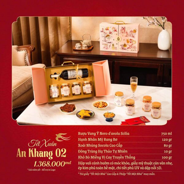 Tết đến, Xuân về, là thời điểm để mọi người sum vầy bên nhau, trao gửi những lời chúc tốt đẹp và tình cảm chân thành. Bộ quà tặng Tết Xuân An Khang 02 chính là sự lựa chọn hoàn hảo để bạn thể hiện sự trân trọng và yêu thương đối với người thân, bạn bè và đối tác. Bộ quà Tết Xuân An Khang 02 được thiết kế dạng hộp vali cao cấp, đem đến cảm giác ấm áp, thể hiện sự tinh tế khi trao tặng.