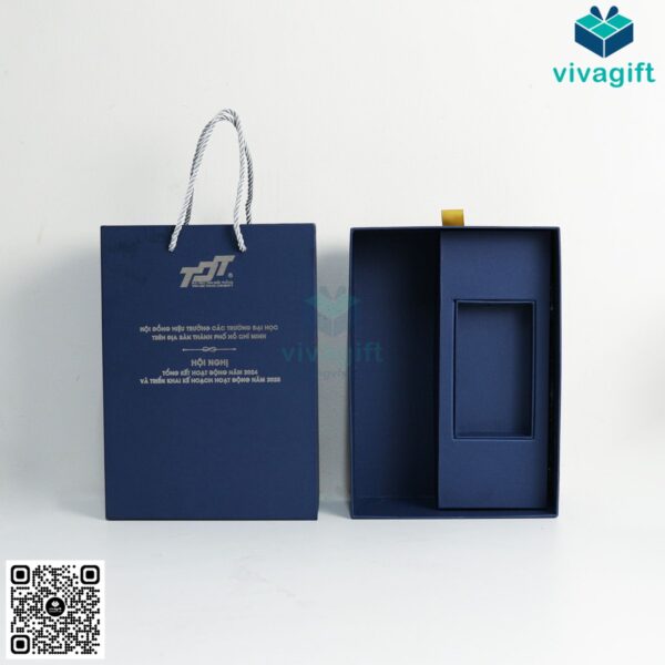 Hộp quai xách đựng áo và sạc dự phòng HAD43 mang lại sự tiện ích và ấn tượng mạnh mẽ. Thiết kế quai xách tiện lợi là điểm nhấn nổi bật, giúp người nhận dễ dàng cầm nắm và mang theo mà không cần túi đựng ngoài, rất thích hợp cho các sự kiện, hội nghị.