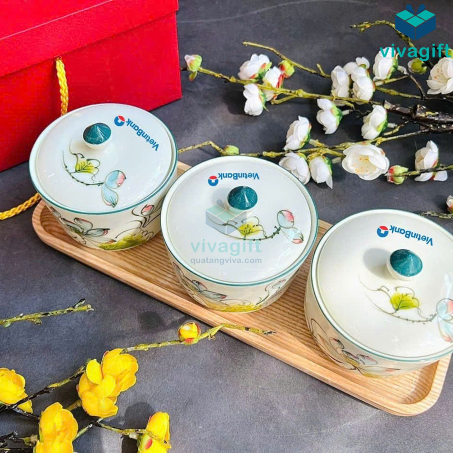 Quà tặng doanh nghiệp Viva cung cấp khay đựng mứt Tết quà tặng, in logo thương hiệu theo yêu cầu, trọn gói. Nhận sản xuất từ 30 bộ, hàng có sẵn kho, đáp ứng đơn cần gấp.