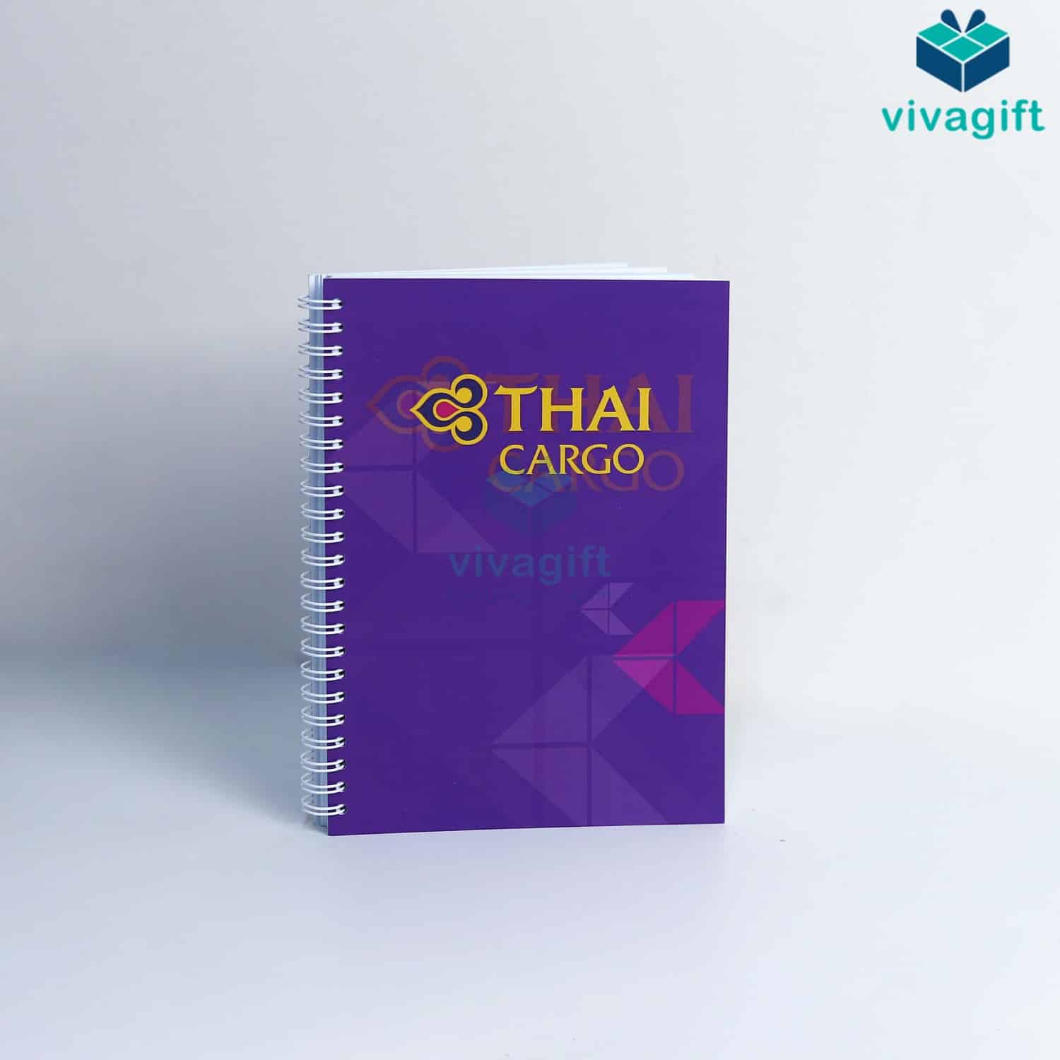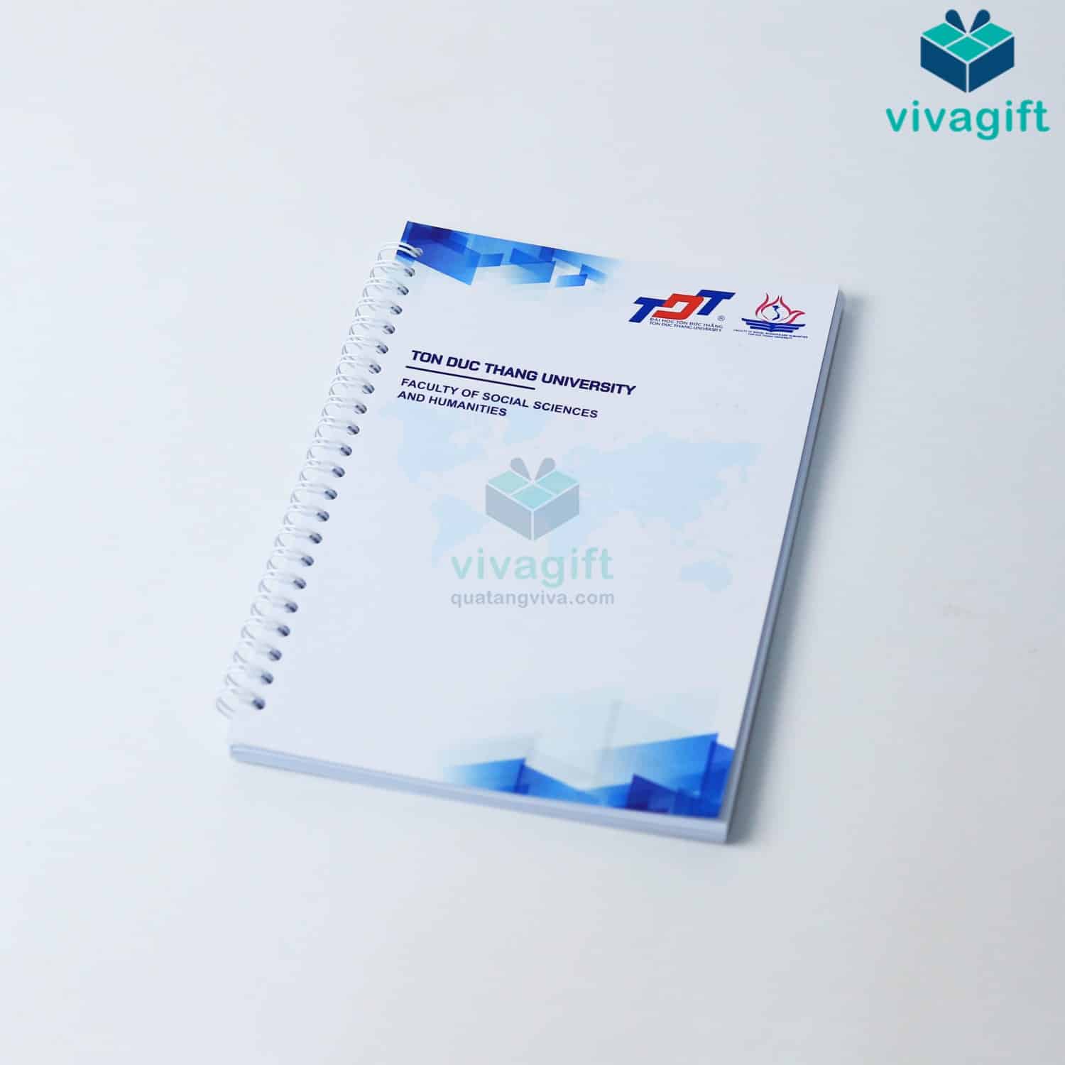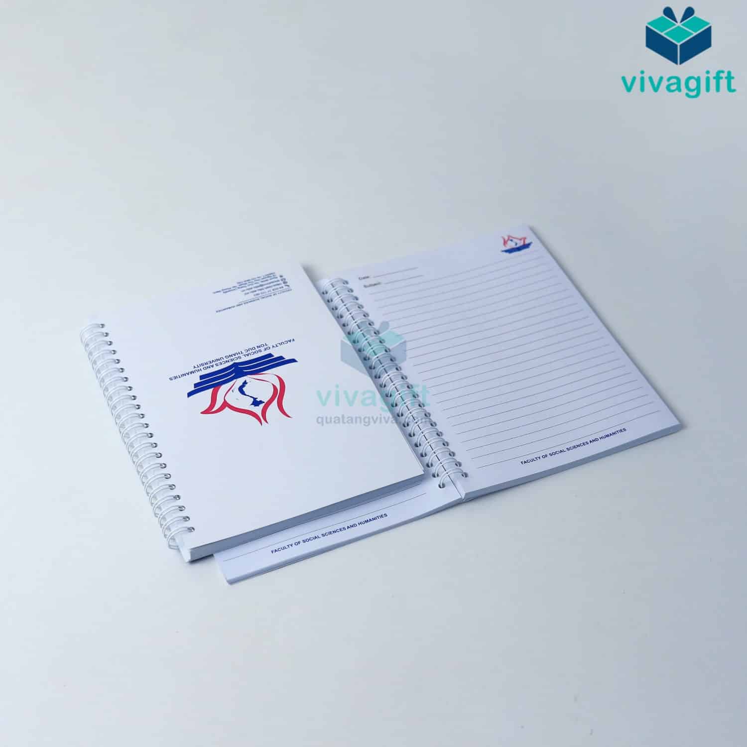 Vivagift in sổ lò xo theo yêu cầu với các kích thước linh hoạt (A4, A5, A6...) in logo theo thiết kế riêng, phù hợp làm quà tặng. Nhận từ 50 cuốn, thời gian sản xuất từ 5–10 ngày.