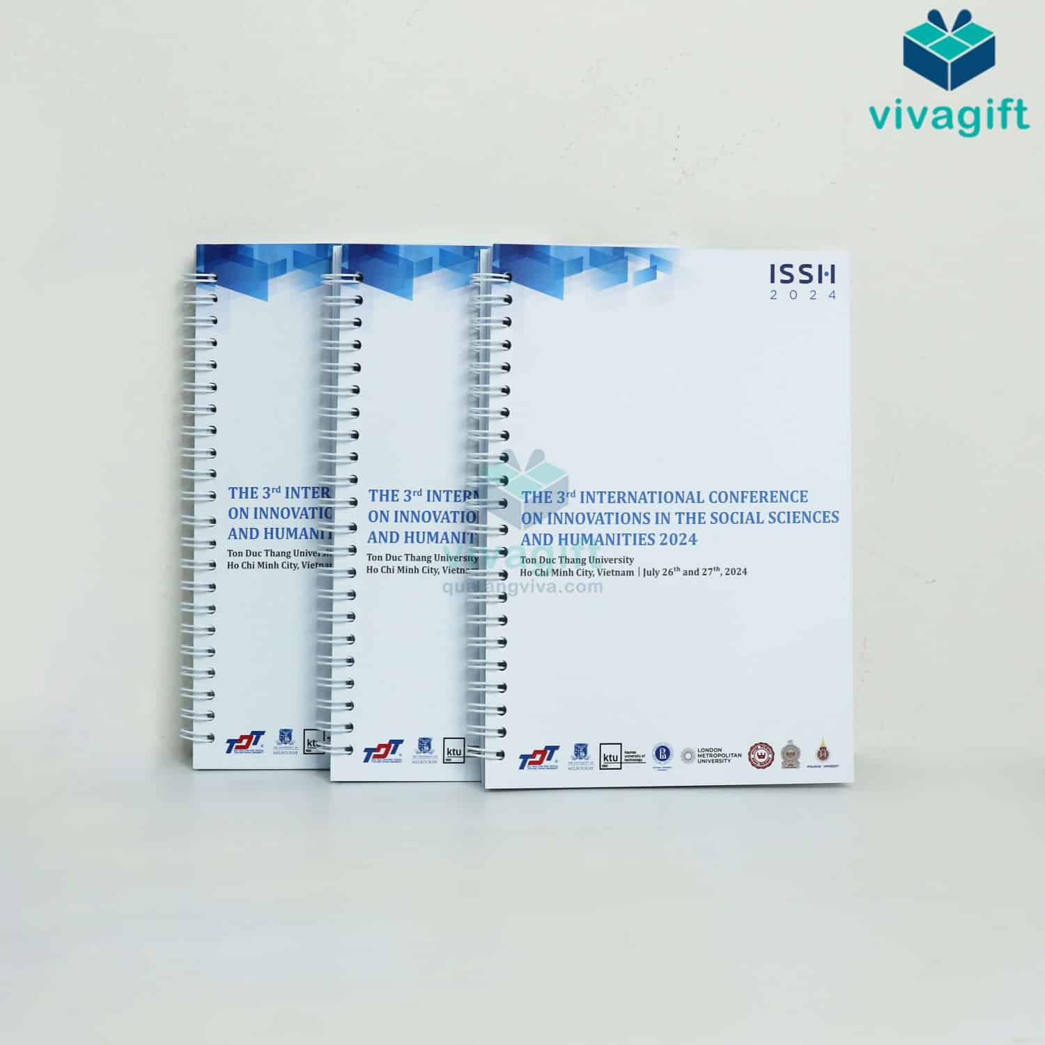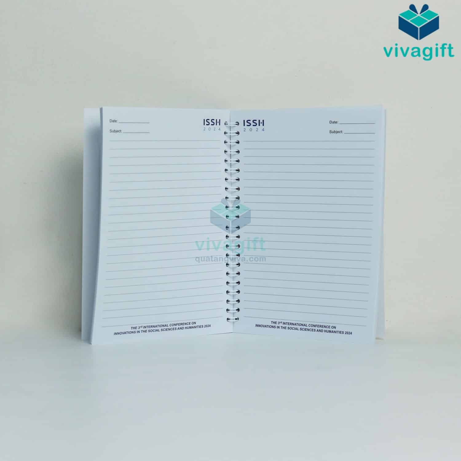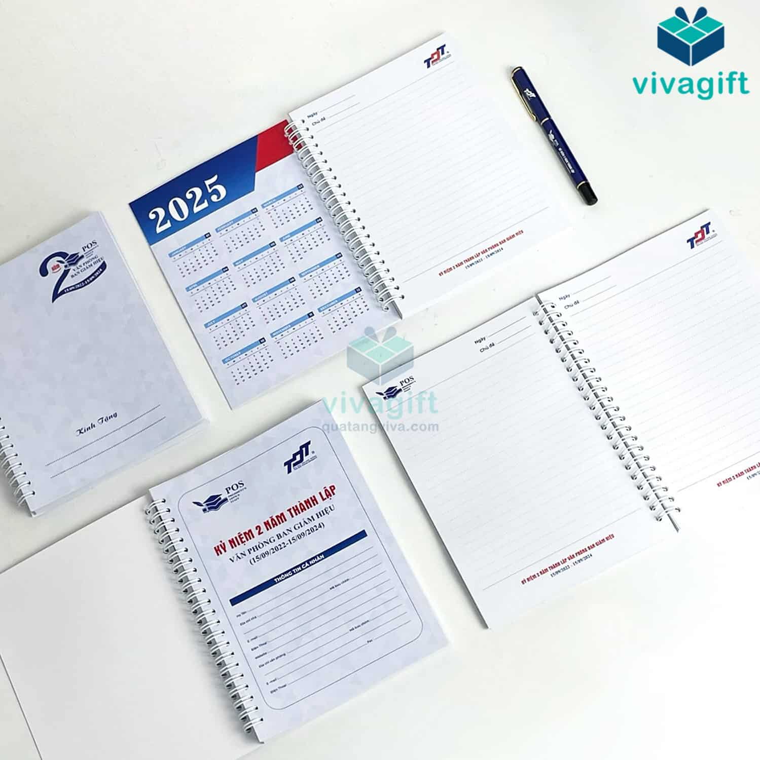 Vivagift in sổ lò xo theo yêu cầu với các kích thước linh hoạt (A4, A5, A6...) in logo theo thiết kế riêng, phù hợp làm quà tặng. Nhận từ 50 cuốn, thời gian sản xuất từ 5–10 ngày.