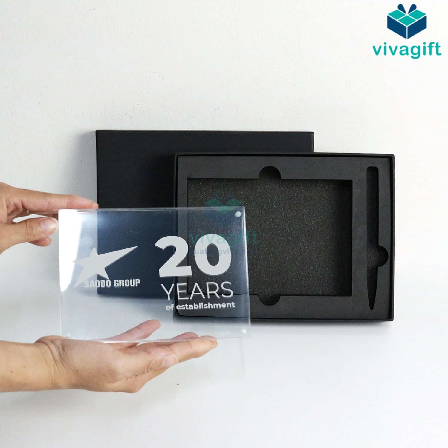 Kỷ niệm chương được làm từ mica trong suốt, in – khắc nội dung theo yêu cầu. Thiết kế hiện đại, dễ trưng bày trên bàn làm việc hoặc tủ kính.