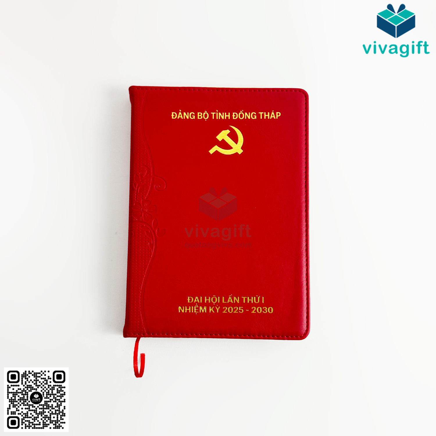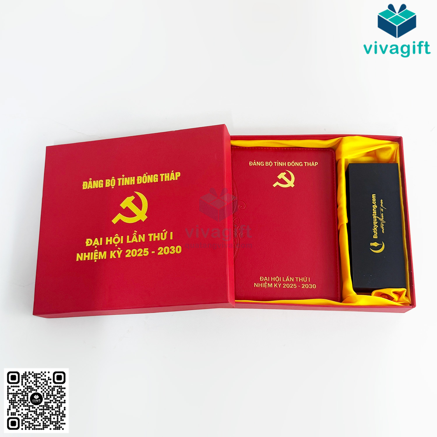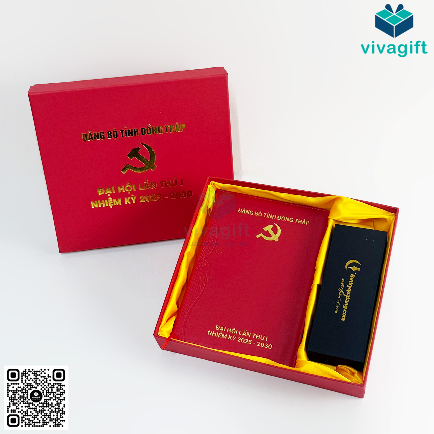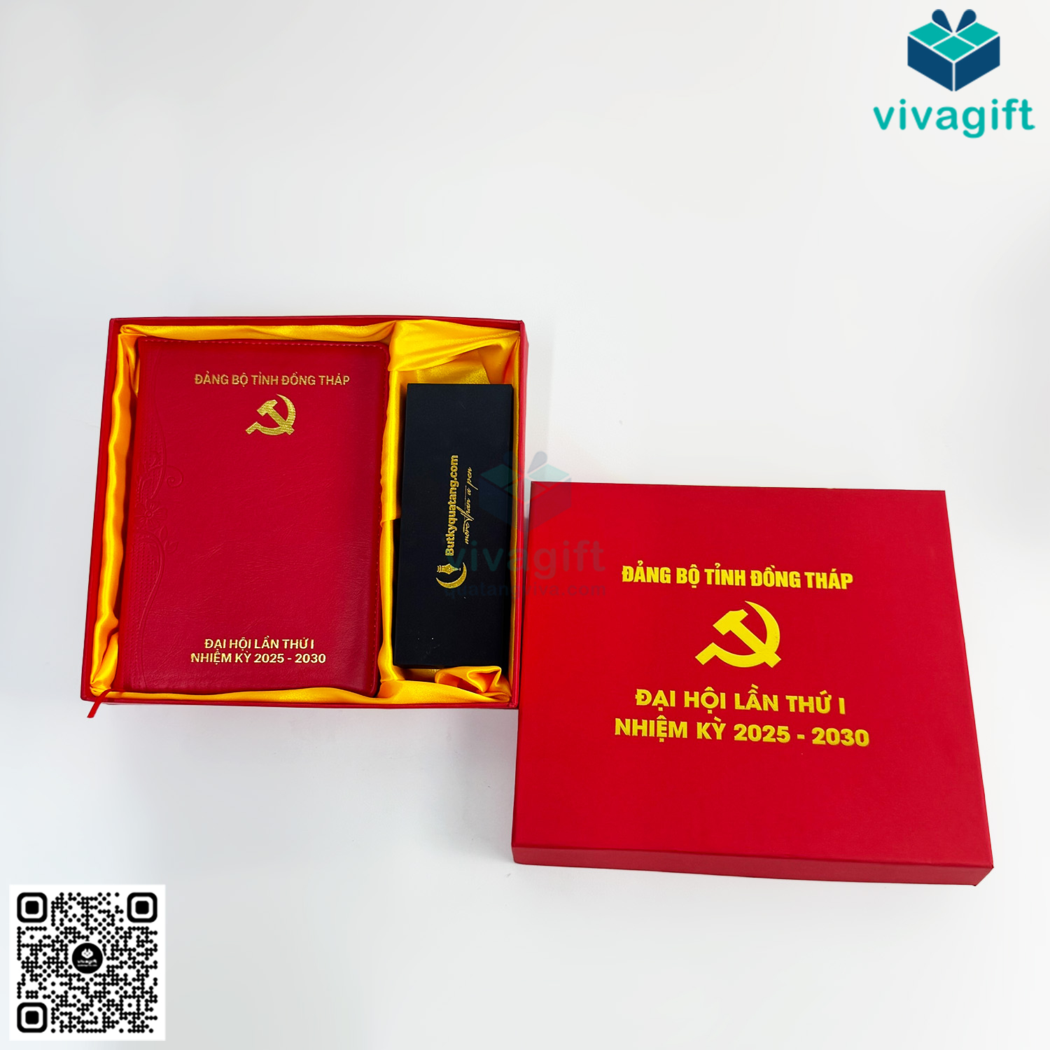 • Sổ da: Bìa da mềm mịn, màu đỏ đồng bộ với hộp quà. Logo được ép kim vàng trên bìa sổ, thể hiện sự chăm chút và cẩn thận trong từng chi tiết. Đây là quà tặng lý tưởng cho những người hay dùng sổ ghi chép trong công việc.