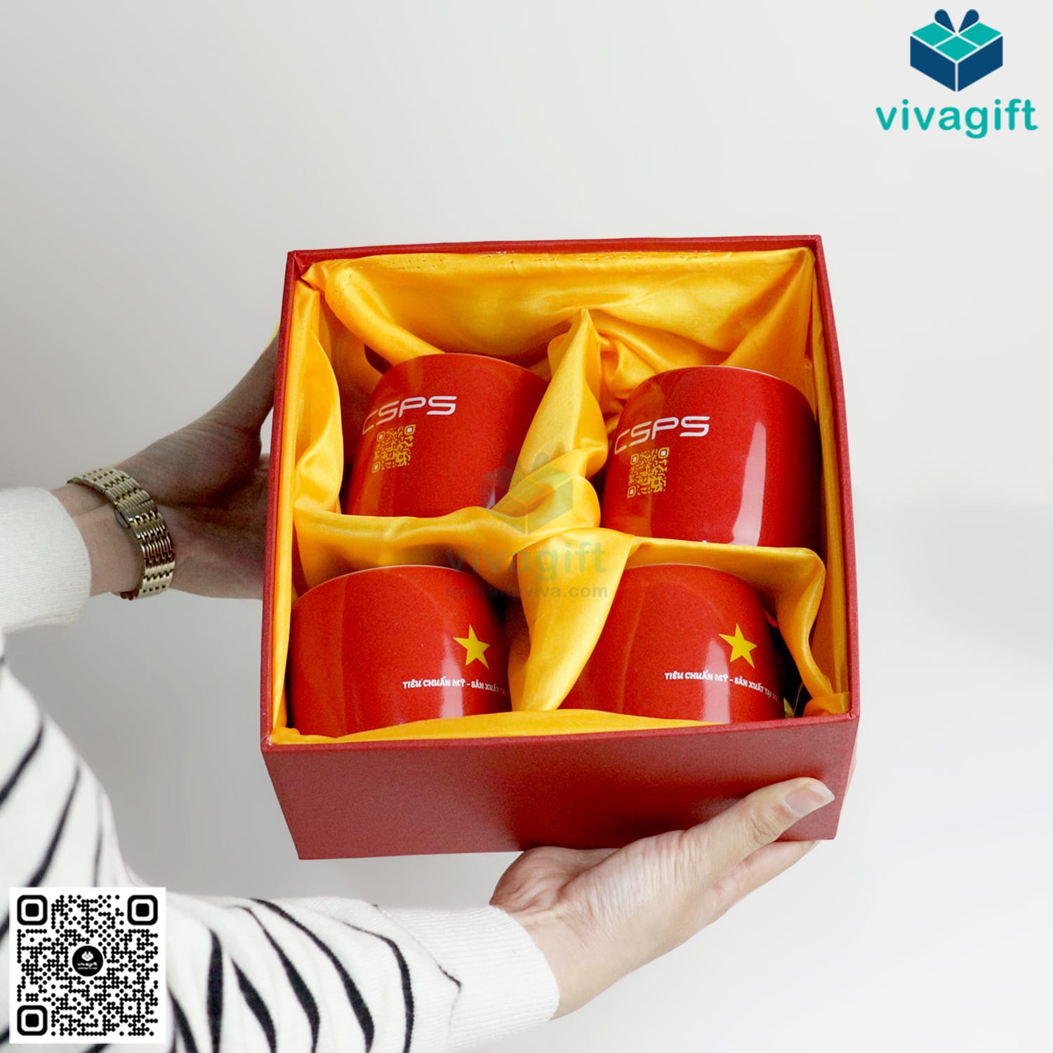 Set quà tặng hộp xi đỏ đựng ly sứ GS198 là lựa chọn sang trọng và ý nghĩa cho các dịp tri ân khách hàng, quà tặng kỷ niệm thành lập, cuối năm. Bộ sản phẩm gồm 4 ly sứ đỏ nổi bật, in ấn logo theo yêu cầu và được đặt trong hộp xi cao cấp lót lụa vàng.