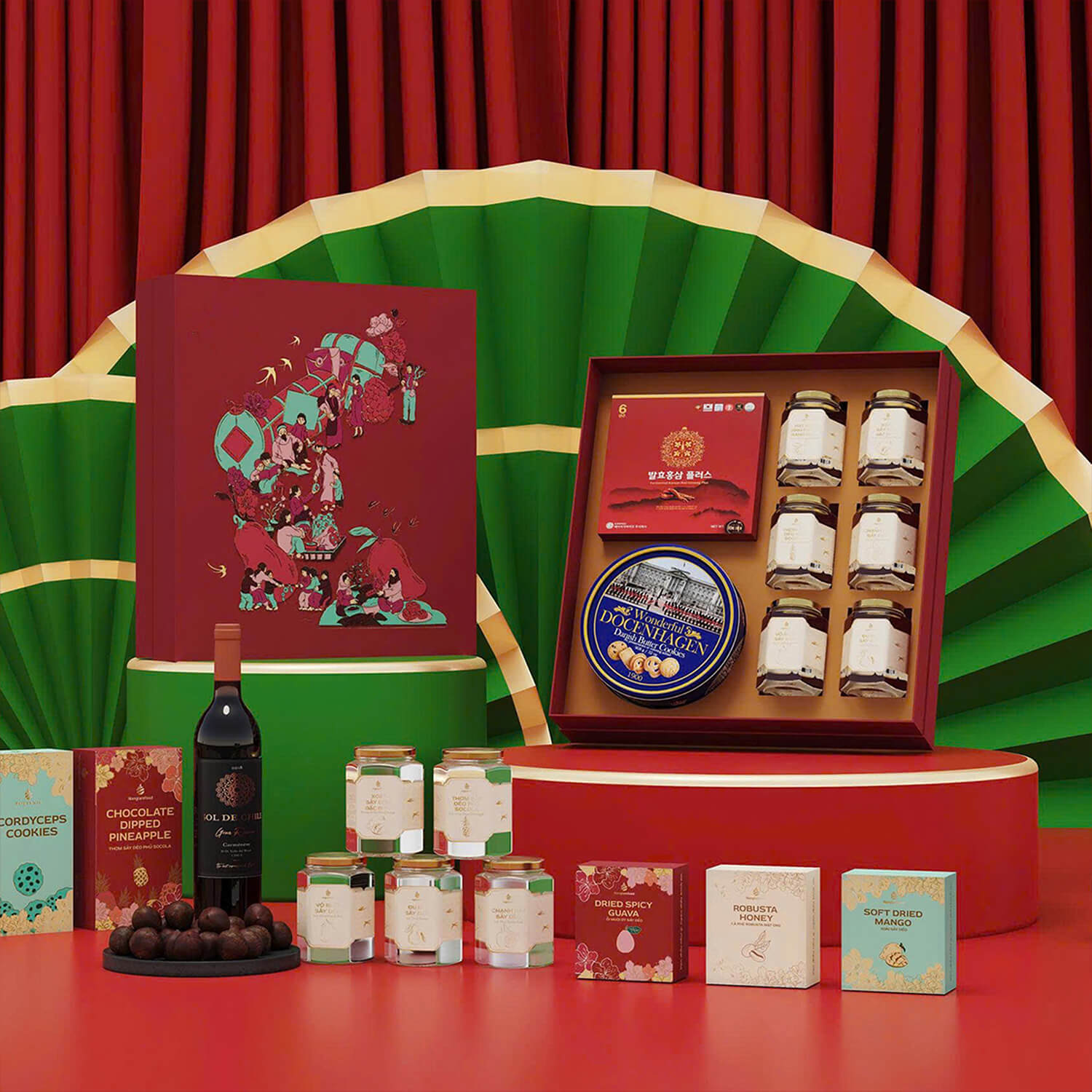 Hộp quà được thiết kế sang trọng, nổi bật với sắc đỏ tượng trưng cho may mắn, cùng các chi tiết dập nổi 3D và ép kim tinh xảo, làm tăng giá trị và vẻ đẹp của món quà.